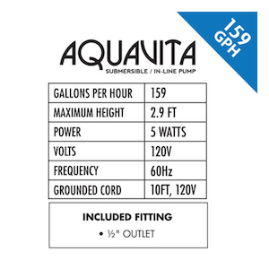 These high quality pumps are perfect for anything from aquariums to hydroponic systems. The bearing, ceramic shaft, and sturdy construction ensure durability and reliability and the attached suction cup feet prevent it from sliding or moving. AquaVita pumps feature an environmentally friendly, oil free, high magnetic rotor for maximum power and a pre-installed removable foam filter which protects the impeller from damage by stray particles. 1 year manufacturer’s warranty. UL listed.