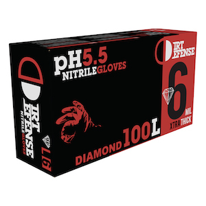 Dirt Defense Diamond Grip 6mil Nitrile Gloves are a textured, nitrile-based, powder-free, disposable glove perfect for hydroponics and horticulture use. Nitrile gloves provide better elasticity than vinyl, better puncture resistance than latex or vinyl, better abrasion resistance than chloroprene, and reduces the likelihood of allergic reaction. Dirt Defense Diamond Grip Nitrile Gloves feature textured fingertips for palm surfaces to enhance grip compared to gloves with smoother textures. This powder-free glove leaves no residue ultimately reducing the risk of contamination compared to a powder lubricated glove.