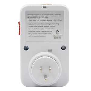 15 minute on/off increments. 15 amp maximum load. 120V. UL approved.