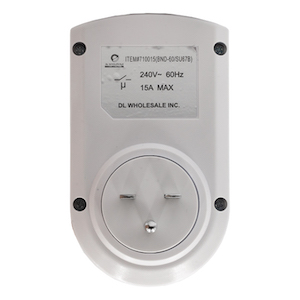 Single outlet digital timer. 1 minute on/off increments. 15 amp max load. 240V. UL approved.