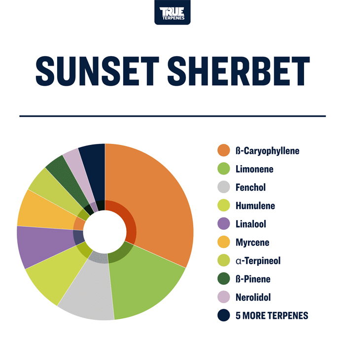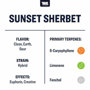 The aromatic profile of Sunset Sherbet is regarded as one of the more enjoyable flowers around. Overall, it is a clean, earthy meets sour strain that also possesses notes ranging from sweet berries to citrus at times. The fruit notes continue after the strain is lit. In some cases, consumers have noted a mint aftertaste when consuming.
