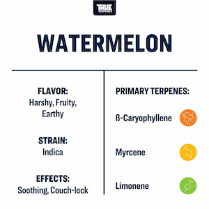 In addition to a Watermelon aroma, consumers often point out additional fruit hints, mainly grape and berries, as well. When ground up, Watermelon is known to give off a skunky smell. The skunky notes have led some, like Wikileaf, to consider if Watermelon’s genetic origin could have OG Kush somewhere in its lineage.