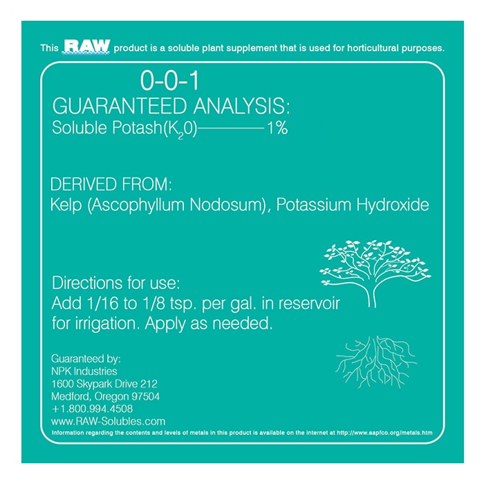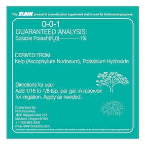 RAW Kelp is 99% kelp extract from seaweed (Ascophyllum Nodosum). This product is fully water soluble. RAW Kelp is a beneficial supplement to all feeding schedules. It is also ideal for adding to foliar sprays and for creating optimal recipe solutions. Works in conjunction with all nutrient and feeding programs.