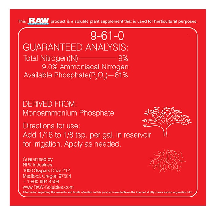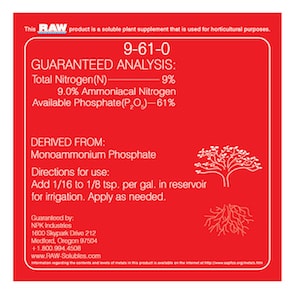 RAW Phosphorus contains 61% pure water Soluble Phosphate (P). This product also contains a small amount of Ammonium Nitrogen (9%) which plants can utilize during bloom. Phosphorus is particularly beneficial during the early rooting stage but also provides energy during fruit and flower production. RAW Phosphorus is ideal for boosting Phosphorus (P) levels, treating deficiencies and creating optimal recipe solutions. Works in conjunction with all nutrient and feeding programs.