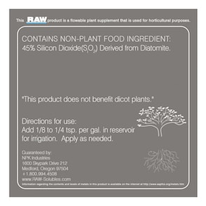 RAW Silica contains 45% Silicon Dioxide which is the highest concentration of silicon dioxide available to the home gardener. RAW Silica is flowable and suspend-able in water and naturally available to the plant. Since RAW Silica is a natural form of silicon dioxide, it is PH neutral and does not cloud when added to water. RAW Silica can be used during all stages of growth and bloom for optimal stem and cell wall strength. It is a beneficial supplement to all feeding schedules. Works in conjunction with all nutrient and feeding programs.