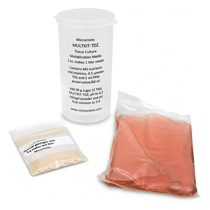 This is the teaching Starter kit that is often purchased before the Complete Microclone Kit.  Plant tissue culture is growth in a nutritional sugar media, the contents of the liquid media.  You are likely familiar with agar-hardened tissue culture media which does not store and ship well and is a grower-mixed component of the Microclone kit.