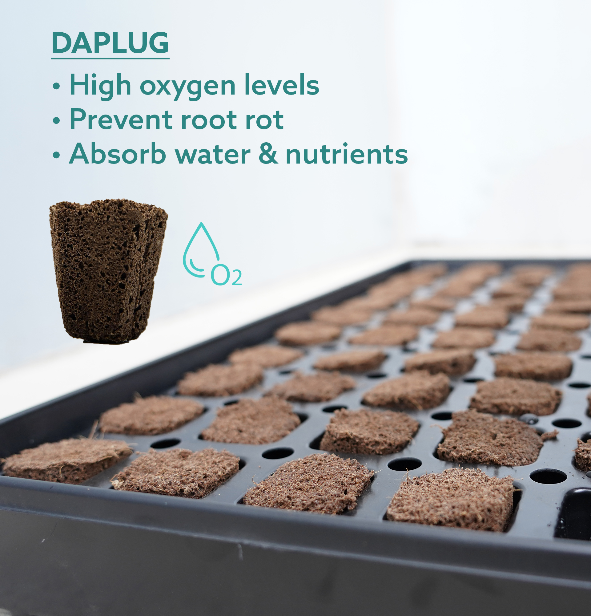 DaPlug Sponge Cubes are a ready-to-use growing medium. For best results, pre-soak the Sponge Cubes in an initial cloning or feeding solution. For sterile applications, DaPlug Sponge Cubes can be boiled before use or before reintroducing cloning or feeding solutions. For non-sterile applications, DaPlug Sponge Cubes contain biocontrol organisms known as Trichoderma, which promote growth and produce a protective defense response. Although you may not always see this, the growth may initially appear white and downy, later developing a yellowish-green or compact green appearance. This is beneficial bacteria, not mold. Any pre-soaking solutions will dissipate these appearances on the Sponge Cubes. DaPlug Sponge Cubes pair well with Root Radiance heat mats for enhanced growth. Warm conditions may cause the Sponge Cubes to dry out more quickly so always ensure that they are thoroughly hydrated. Firmly squeeze the Sponge Cubes to check the moisture level.