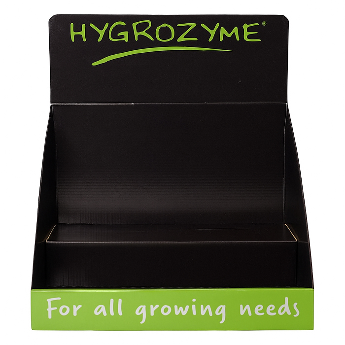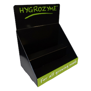 Constructed from durable cardboard with a sleek black finish and bold green HYGROZYME branding, it’s perfect for countertops, shelves, and point-of-sale areas. The clear, professional presentation reinforces product recognition and encourages add-on sales.