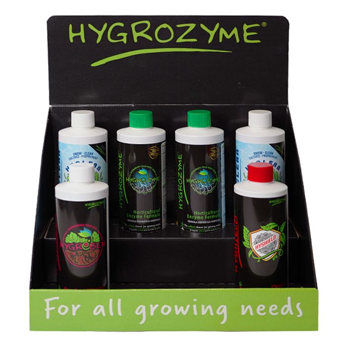 Showcase your HYGROZYME products with this eye-catching branded countertop display. Designed specifically to hold up to eight 500ml bottles, this sturdy and attractive display helps keep your retail space organized while drawing attention to the HYGROZYME line.