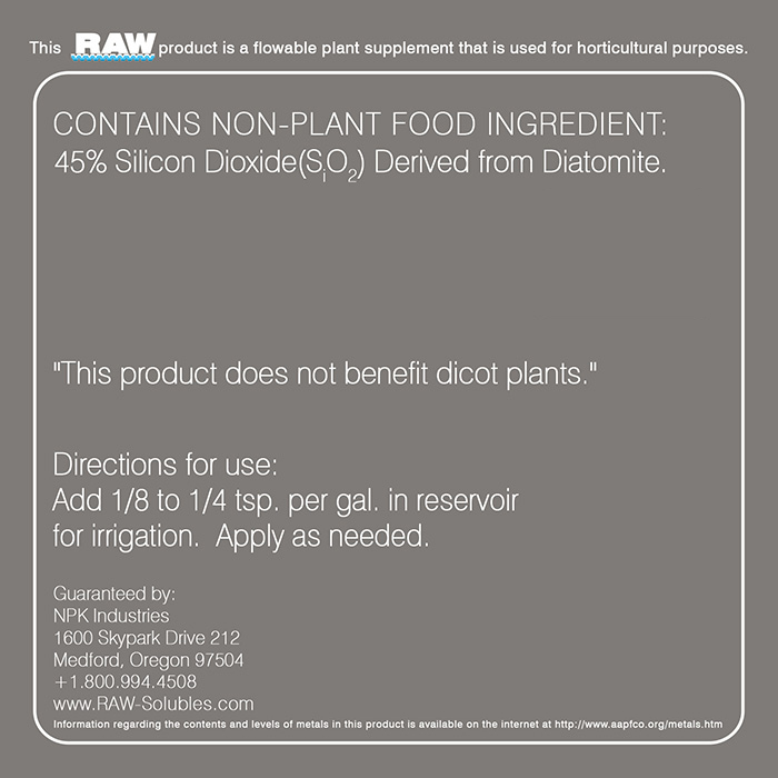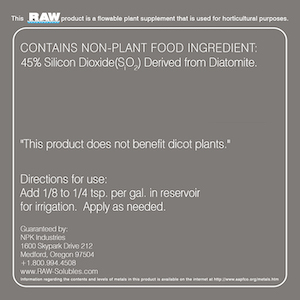 RAW Silica contains 45% Silicon Dioxide which is the highest concentration of silicon dioxide available to the home gardener. RAW Silica is flowable and suspend-able in water and naturally available to the plant. Since RAW Silica is a natural form of silicon dioxide, it is PH neutral and does not cloud when added to water. RAW Silica can be used during all stages of growth and bloom for optimal stem and cell wall strength. It is a beneficial supplement to all feeding schedules. Works in conjunction with all nutrient and feeding programs.