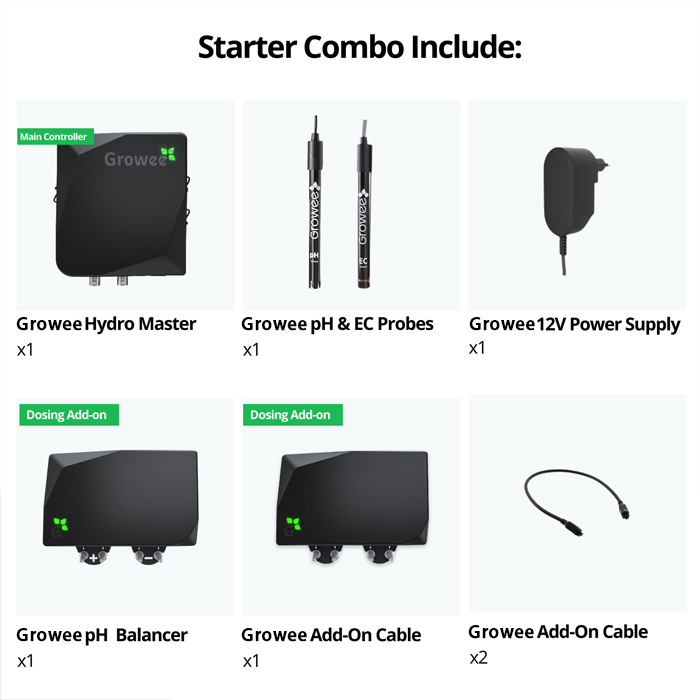 The Growee Starter Combo takes Hydroponics control to a whole new level with full pH control and automatic nutrient dosing, ensuring your Hydroponics growing system is kept at the perfect pH level and EC/TDS levels 24/7.
