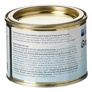 Convenient method of eliminating troublesome pests and spores from the greenhouse. Simply light the wick and the gas produced will fumigate all exposed parts. A 225g Sulphur Candle will fumigate 14 cubic metres.