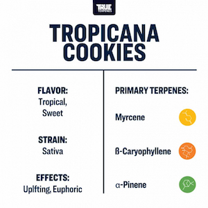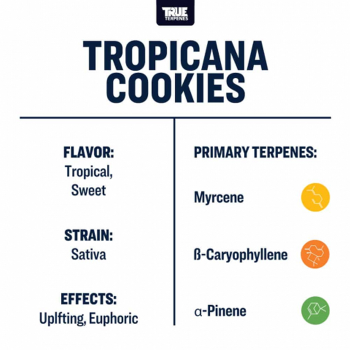 Tropicana Cookies Infused Strain Profile takes the uplifting and euphoric Tangie and GSC strains and boosts the good vibes with tropical cookie sweetness. Full Flavor. Full Effect.
