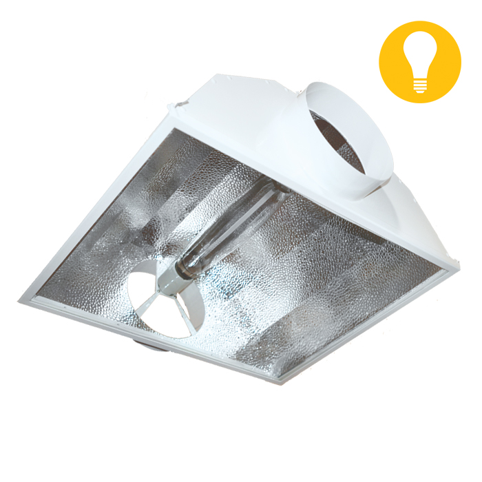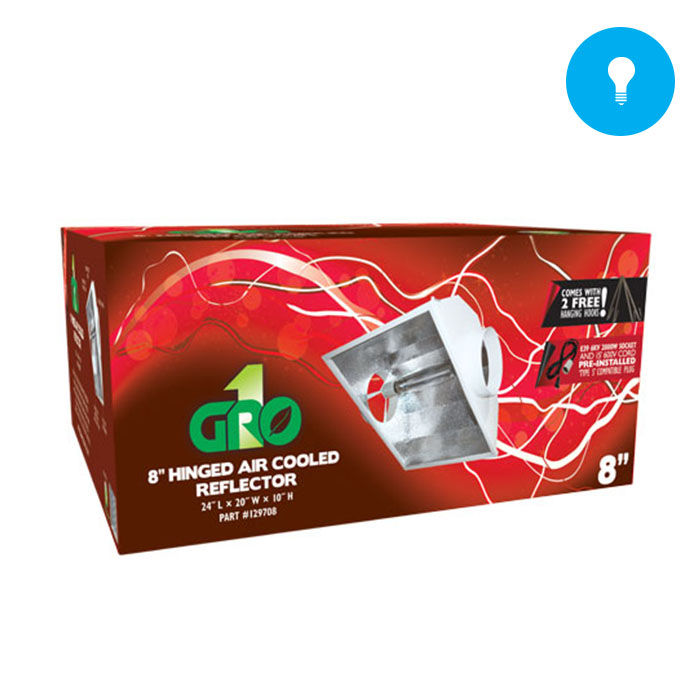 8" Air cooled Reflector - Air-Cooled with a flange to attach your ducting directly to the reflector. Designed specifically for the horticulture industry. With powder coated steel to ensure a long life. This high quality reflector can be used alone or in a line with many others. Connected by ducting to a sufficient fan this reflector will produce optimum results with cool and efficient operation. Comes with removable glass for easy cleaning Pre-installed lamp socket, 15' cord, and 2 hanging clips included. Hinged flip down glass for easing cleaning. Works with all wattage MH and HPS lamps. Completely assembled ready to use.