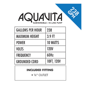 These high quality pumps are perfect for anything from aquariums to hydroponic systems. The bearing, ceramic shaft, and sturdy construction ensure durability and reliability and the attached suction cup feet prevent it from sliding or moving. AquaVita pumps feature an environmentally friendly, oil free, high magnetic rotor for maximum power and a pre-installed removable foam filter which protects the impeller from damage by stray particles. 1 year manufacturer’s warranty. UL listed.