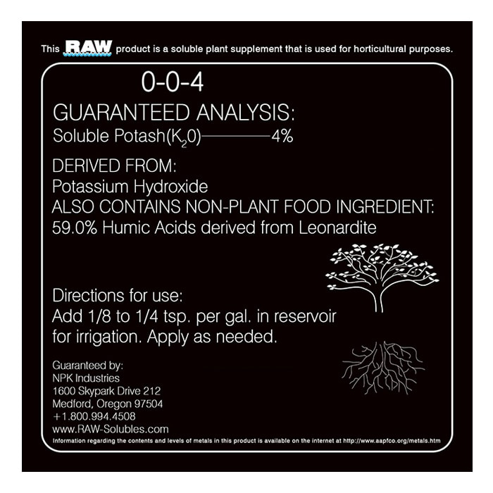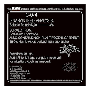 RAW Humic Acid contains 59% Humic Acids derived from Leonardite which is the most concentrated, water Soluble humic acid product on the market today. In nature, humic acid has a buffering effect on the pH of soils. It can raise the pH of acid soils and lower the pH of alkaline soils. RAW Humic Acid is also great for hydroponics applications, especially when added to RO filtered water. RAW Humic acid is a natural chelator and is a beneficial supplement to all feeding schedules. Works in conjunction with all nutrient and feeding programs.