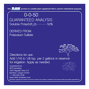 RAW Potassium contains 50% Water Soluble Potash derived from potassium sulfate. During fruiting and flowering, large amounts of potassium are used by the plant in a matter of days which can lead to potassium deficiencies. RAW Potassium is ideal for boosting Potassium (K) levels, treating deficiencies and creating optimal recipe solutions. Works in conjunction with all nutrient and feeding programs.