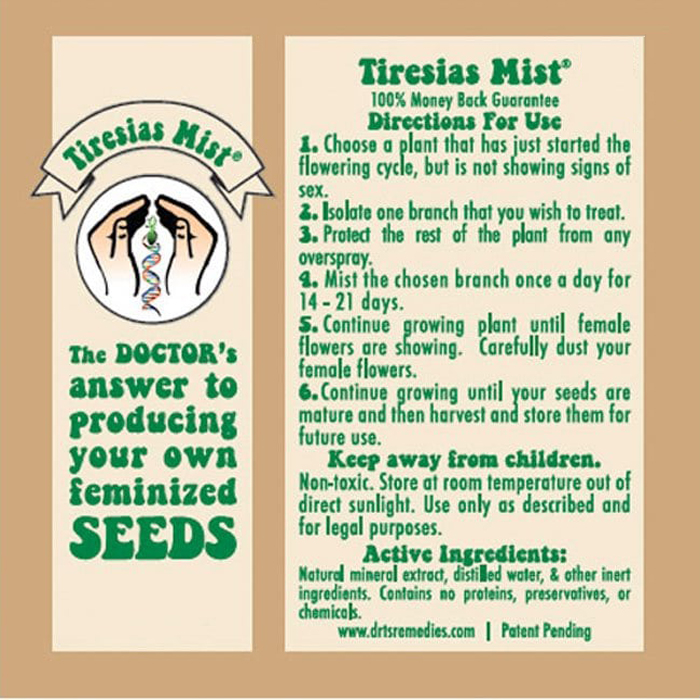 Tiresias Mist allows for even the most amateur grower to produce their own feminized seeds. The active ingredient in Tiresias Mist is safe and effective. A one ounce bottle will treat one branch of a plant to produce feminized seeds on the same plant, or to produce genetically female crosses with other plants. What you are doing using Tiresias Mist, is taking a female plant, treating one branch and enabling that one branch to create male characteristics i.e. pollen sacs. You can then take the pollen from that branch and pollinate the flowers of the rest of the plant to produce seeds that will, 100% of the time, be feminized.