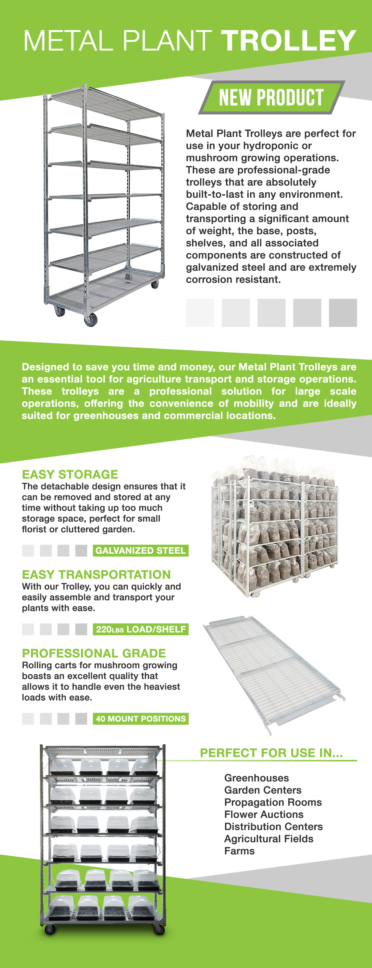 Metal Plant Trolleys are perfect for use in your hydroponic or mushroom growing operations. These are professional-grade trolleys that are absolutely built-to-last in any environment. Capable of storing and transporting a significant amount of weight, the base, posts, shelves, and all associated components are constructed of galvanized steel and are extremely corrosion resistant. The four included posts include 40 mounting positions allowing you to dial in the canopy space required for your grow. Each trolley includes six heavy-duty grade shelves capable of holding 220lbs each. We offer additional shelves to allow you to truly customize your trolley with the right amount of storage space (sold separately).