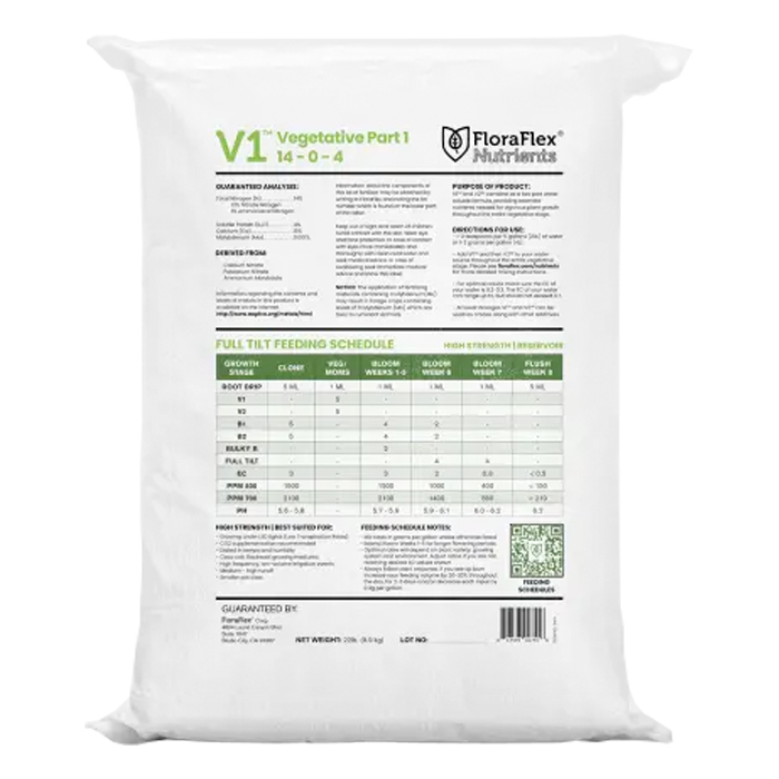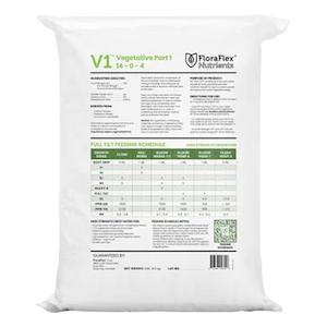 FloraFlex has engineered the highest quality, cleanest, and most pH stable nutrients on the market. V1 and V2 combine as a two-part water-soluble formula, providing essential nutrients needed for vigorous plant growth throughout the entire vegetative stage. At lower dosages, V1 and V2 can be used as a base along with other additives.